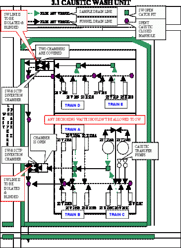 In normal operation, there will be periodic blow down of spent caustic from wash drum and during sample collection for caustic concentration. All the liquid effluents are to be routed to the spent caustic treatment plant. The diagram No: 3.1 show in detail the wastewater collection system in CWU with necessary instructions.