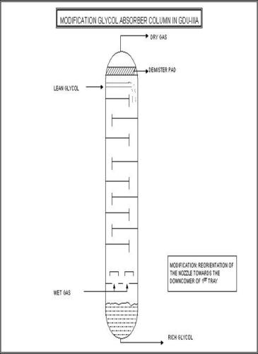 Gas feed nozzle was modified by re-orienting the nozzle towards downcomer of 1st tray of absorber. The top bubble cap tray has been made dry. This modification has been done to minimise glycol loss.
