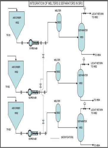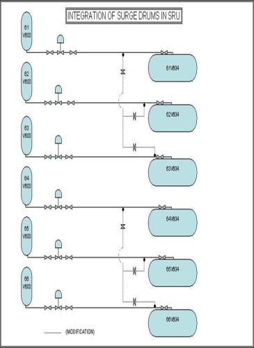 The Surge Drums of all trains are integrated. This facilitates the storage of molten sulfur produced from any of the trains, into any of the surge drums. Normally molten sulfur produced from all Ph- I trains is stored in one surge drum (61/62/63 V604) and from Ph- II & III trains in another surge drum (64/65/66 V604). The schematic is at sl no 17.
