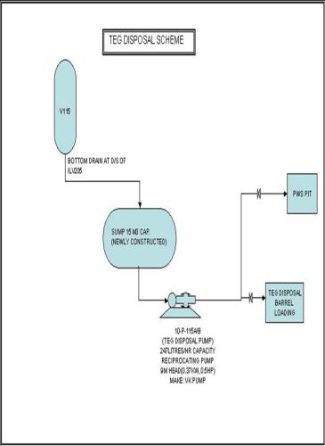 The modification for safe disposal of MDEA from Inlet suction KOD (V101) of LPG plant and TEG from condensate surge drum (V115) has been done. For this purpose two no of sumps have constructed for safe disposal to PWS pits. The system is functional.